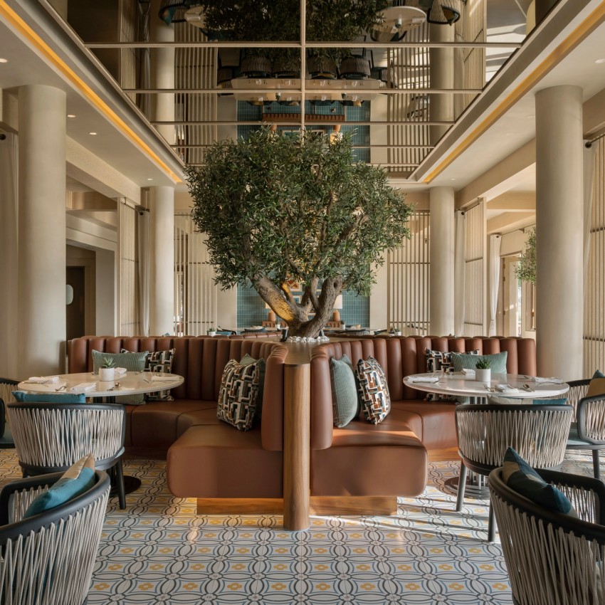 La vegetación debía reflejar esta misma narrativa, rica en historia y encanto. Los olivos fueron la elección natural, con sus impresionantes 500 años de vida que sirven como ventanas vivas al pasado. Se necesitó un total de 23 olivos para dotar de carácter a todo el complejo, desde el vestíbulo hasta el spa, los cuatro restaurantes y los tres salones. Sin embargo, la arquitectura tradicional de Bab Al Shams en Oriente Medio planteaba un reto por sus pequeñas ventanas e interiores sombreados, ya que los olivos suelen necesitar mucha luz solar para desarrollarse.