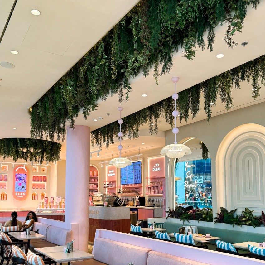 Recomendamos nuestra gama FireSilx, una colección de árboles, plantas y follaje artificiales intrínsecamente ignífugos certificados para cumplir las normas de seguridad mundiales. Esta gama se ajustaba perfectamente a las necesidades de EL&N Dubai, ya que ofrecía una amplia selección de vegetación que podía integrarse perfectamente en el vibrante espacio. Los diseños elegidos incluían sutiles acentos vegetales en los alféizares de las ventanas, que añadían un toque suave a los luminosos interiores de la cafetería, y senderos colgantes que se descolgaban graciosamente del techo, aportando profundidad y movimiento al diseño general.