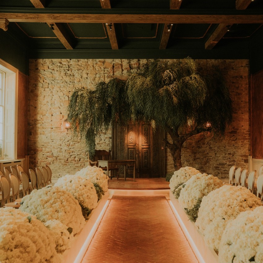 Enclavado en North Yorkshire, The Croft fue diseñado para destilar elegancia y alegría. El diseñador del lugar solicitó un impresionante sauce hecho a medida como llamativo centro de mesa detrás del altar. Junto a él, una selección de productos para crear una atmósfera suave y neutra. Se eligieron tonos de flores blancas y crema para dar una sensación vintage y acogedora a la vez que se evitaba cualquier elemento demasiado brillante.