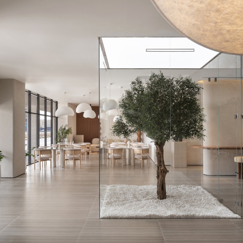La elección del olivo para este espacio se basó en su rico simbolismo y su elegancia natural. Conocido por representar la paz y la sabiduría atemporal, el olivo complementa a la perfección el ambiente tranquilo y enraizado que C'est Ici pretendía conseguir. Su presencia realza el ambiente terrenal y sereno del café, impregnando el espacio de un profundo sentido histórico y enriqueciendo la experiencia global con su belleza orgánica.