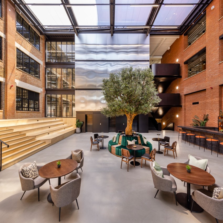 En estrecha colaboración con Suna Design, nos aseguramos de que la copa tuviera una generosa altura de 2,25 metros, para que la gente pudiera sentarse bajo el árbol sin riesgo. Con un techo de cristal encima, existía la preocupación de que el follaje se volviera azul o perdiera vitalidad con el tiempo. Para evitarlo, utilizamos nuestro follaje de olivo UVSilx y FireSilx, que proporciona seguridad contra incendios y un color duradero, a la vez que complementa a la perfección el entorno.